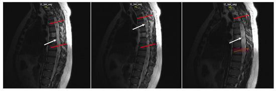 Sequential sagittal T2-weighted MRI scans of the thoracic spine demonstrate the syrinx (white arrow) extending inferiorly down to the Th12 level with the greatest dilation around Th3-Th7 (between the red lines).