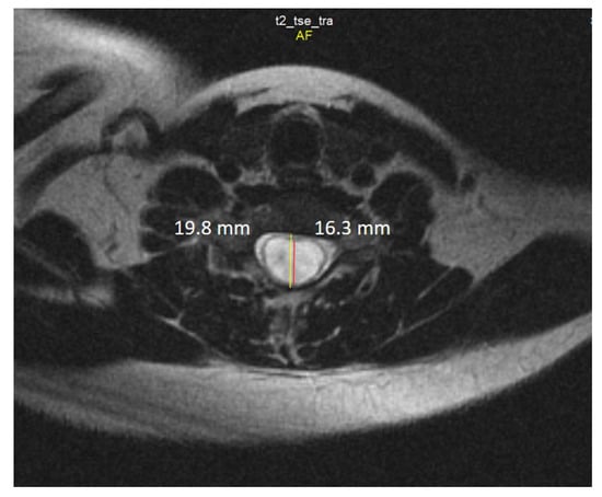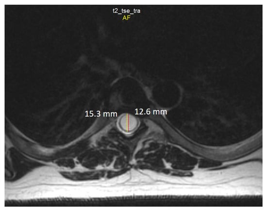 Axial T2-weighted MRI scan of the thoracic spine demonstrates the anteroposterior dilation of the syrinx (red line) and spinal cord (yellow line) at the level of the Th6 vertebra.