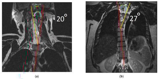 T2-weighted MRI scan of the cervical (a) and thoracic spine (b) demonstrate scoliosis at the cervicothoracic level. Note: Red lines are drawn along the axis of the spine; yellow lines are drawn by the deviated part of the spine from the axis of the spine; blue arrows indicate the direction of curvature. In degrees, deflection angle in the cervical region (α) and in the thoracic region (β) is determined.