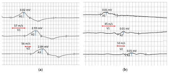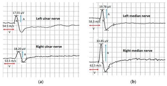 Sensory conduction velocity of the upper extremities nerves. (a) Sensory conduction velocity (V) and sensory nerve action potential amplitude of the left and right ulnar nerves. (b) Sensory conduction velocity (V) and sensory nerve action potential amplitude (A) of the left and right median nerves. Blue arrows show compound muscle action potential amplitude and red arrows show conduction velocity.