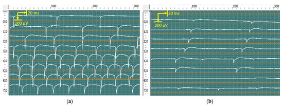 At rest, pronounced spontaneous activity was registered, such as fibrillation potentials, positive sharp waves (Figure 10), and fasciculation potentials (Figure 11) in the right abductor pollicis brevis muscle, bilateral abductor digiti minimi, and bilateral first dorsal interosseous muscle of the hand. Rare fibrillation, positive sharp waves, and fasciculation potentials waves were registered on bilateral examination of the deltoid muscle, biceps brachii muscle, and brachioradialis muscle and in the left abductor pollicis brevis muscle. In muscles, the f hands firing rate, frequency, and amplitude of positive sharp waves and fasciculation potentials were markedly higher on the left side.