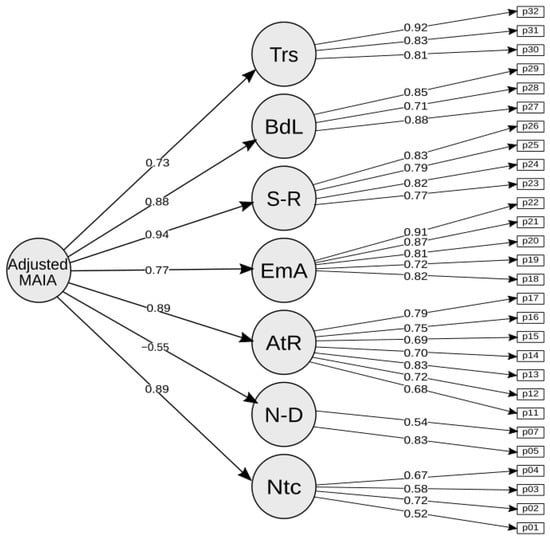 To date, studies have been conducted on the psychometric characteristics of the MAIA in different linguistic and sociocultural groups. Most studies have maintained the original eight-factor model. Some have found problems with the estimation of the Not Distracted and Not Worried subscales. Items 8 and 10 of the Not Worried subscales have been consistently problematic because of their low factor loadings or loading on other factors [13,14,15]. There are proposed six-factor versions, excluding the dimensions mentioned above, and other proposals that maintain the eight factors with item modifications.