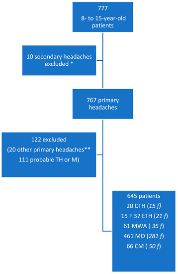 Flow chart depicting patient inclusion criteria. TH: tension-type headache; M: migraine; ETH: episodic tension-type headache; CTH: chronic tension-type headache; MWA: migraine with aura; MO: migraine without aura; CM: chronic migraine; * post-traumatic, cranial hyper- and hypotension, somatoform disease, cranial neuralgia; ** 1 nummular headache, 2 primary exercise headaches, 11 primary stabbing headaches, 2 benign paroxysmal vertigo episodes, 1 abdominal migraine, 2 cyclical vomiting syndrome, 2 new daily persistent headaches.