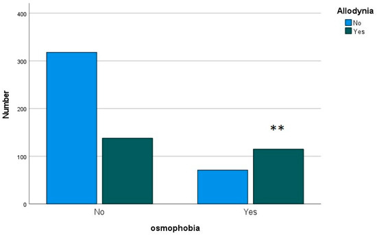 In terms of frequency, we did not find a different distribution of headache frequency within the groups between patients with or without osmophobia (chi-squared 3.58; DF 4; p = 0.46). The MANOVA analysis, including headache features, such as pericranial tenderness, maximal headache intensity evaluated from 0 to 10, headache duration in years, osmophobia and headache diagnosis as factors, showed a difference between osmophobic and non-osmophobic children (F Roy squared 3.34; p = 0.019) and among different headache diagnoses (F = 6.76; p < 0.001). The interaction between osmophobia and headache diagnosis was not significant (F = 2.16; p = 0.091). In detail, headache duration was significantly longer in children reporting acute osmophobia (F = 9.55; p = 0.002). Considering headache diagnosis, the intensity of headache was reported as significantly lower in children suffering from episodic tension-type headaches, compared to all migraine groups (F 6.55; p < 0.001; Bonferroni: CTE vs. MO, MA, and CM p < 0.01) (Table 2). Most of the patients with osmophobia presented with acute symptoms of allodynia (chi-squared 55.12; DF 1; p < 0.001) (Figure 2). All five CTH patients with osmophobia had symptoms of allodynia.