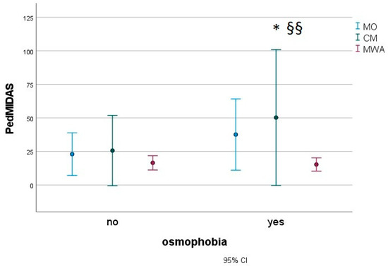 Mean and 95% C.I. of PedMIDAS scores in osmophobic and non-osmophobic migraine children. MWA: migraine with aura; MO: migraine without aura; CM: chronic migraine. Results for osmophobia as a factor * F 4.87, p = 0.028; diagnosis as a factor §§ F 7.93, p < 0.001; Bonferroni CM vs. MO and MWA, p < 0.05).
