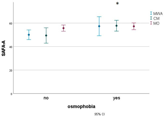 Mean and 95% C.I. of SAFA-Anxiety scores in osmophobic and non-osmophobic migraine children. MWA: migraine with aura; MO: migraine without aura; CM: chronic migraine. Results for osmophobia as a factor * F 4.91, p = 0.028.