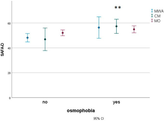 Mean and 95% C.I. of SAFA-Depression scores in osmophobic and non-osmophobic migraine children. MWA: migraine with aura; MO: migraine without aura; CM: chronic migraine. Results for osmophobia as a factor ** F 9.18, p = 0.003.