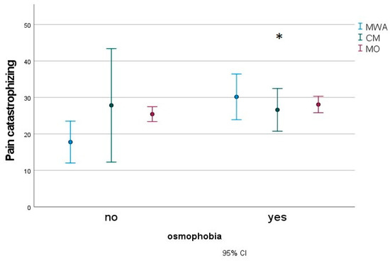 Mean and 95% C.I. of Pain Catastrophizing scores in osmophobic and non-osmophobic migraine children. MWA: migraine with aura; MO: migraine without aura; CM: chronic migraine. Results for osmophobia as a factor * F 4.34, p = 0.038.