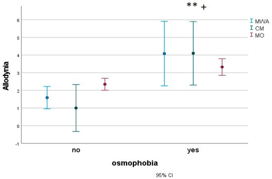 Mean and 95% C.I. of Allodynia scores in osmophobic and non-osmophobic migraine children. MWA: migraine with aura; MO: migraine without aura; CM: chronic migraine. Results for osmophobia as a factor ** F 0.87, p = 0.028; + osmophobia and diagnosis F 6.2, p = 0.002.