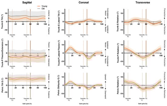 Ensemble averages for trunk-G (trunk relative to global reference frame), trunk-P (trunk relative to pelvic reference frame) and pelvis kinematics. Orange line = YG mean, grey line = OG mean, orange shaded area = YG SD, grey shaded area = OG SD. FO = Foot-off, IC = Initial contact.