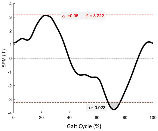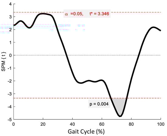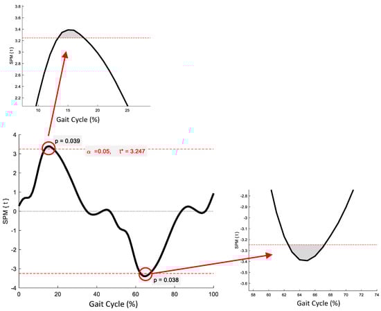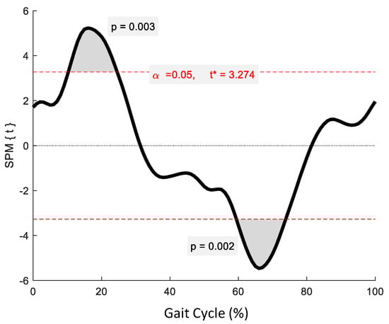 To identify phase-specific differences in kinematic waveforms during the GC between age groups, SPM two-tailed independent t-tests [25] were performed in MATLAB (R2019a, version 9.6.0.1072779, The MathWorks, Inc., Natick, MA, USA) and implemented using the open-source one-dimensional SPM code (spm1D-package, version 0.4.3, http://spm1d.org/index.html, accessed on 15 July 2020). The primary advantage of SPM is that abstraction of the originally sampled time series does not need to be performed to statistically analyse the data. Interpretation is therefore, more intuitive for time-series data where the statistical result is also a time-series; in this case, a time-series of t-values. If instantaneous values of the kinematic waveforms crossed the critical threshold (at which α = 5% of smooth random curves would be expected to traverse), a supra-threshold cluster depicted by grey shading indicated a significant difference (p < 0.05) between groups at a specific phase in the GC. Graphical presentation of the kinematic waveforms was performed using GraphPad Prism (Version 8.3.1, San Diego, CA, USA). Data are presented as means with standard deviations (mean ± SD) unless otherwise stated.
