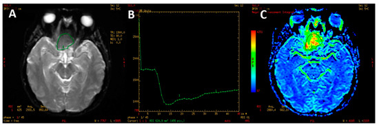 Adamantinomatous craniopharyngioma. PWI image (A). T2* signal intensity curve with rapid return, exceeding the baseline signal (B). Color-coded map of cerebral blood volume with minor perfusion values within the tumor (C).