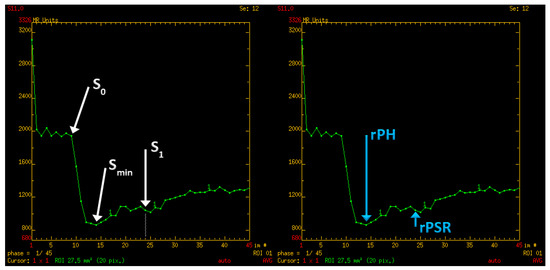 Perfusion curve parameters: S0—A baseline signal intesity; Smin—minimal signal values during first pass of gadolinium contrast; S1—signal intensity recovery 14 s after the beginning of the signal drop; rPH—relative peak height; rPSR—relative percentage of signal recovery.
