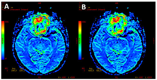 - Mean perfusion parameters for the whole tumor (labeled as rCBV’1)—the arithmetic mean of the perfusion values collected by outlining the tumor with ROIs on each axial slice (Figure 4A).
