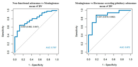 In our study, non-functional pituitary adenomas (n = 51) showed mean rCBV = 2.87 for the whole tumor (range 0.29–6.95), maximum rCBV = 4.73 (range 0.43–20.38). Similarly, adenomas with endocrine function (n = 11) showed mean rCBV = 2.61 (range 1.09–4.91) and maximum rCBV = 4.33 (range 1.34–10.54). In comparison, meningiomas received higher values, both mean and maximum rCBV: 5.09 (range 2.11–11.33) and 8.25 (range 2.99–25.17), respectively. Differences in rCBV values were statistically significant between meningiomas and all groups of adenomas. We established the subsequent cut-off points with the highest accuracy (Table 2, Figure 5):