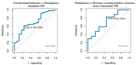 In the case of the rPH perfusion parameter, non-functional pituitary adenomas showed mean rPH = 1.63 (range 0.63–5.92) for the whole tumor and maximum rPH = 2.51 (range 0.28–8.61). Adenomas with endocrine function received similar values of mean rPH = 1.51 for the whole tumor (range 0.2–3.3) and maximum rPH = 2.32 (range 0.2–4.35). Consistently, rPH values of meningiomas were higher than PitNETs, with mean rPH = 2.28 (range 0.99–5.60) and maximum rPH = 3.90 (range 1.07–9.01). According to ROC curves, the maximum rPH and mean of maximum rPH values of meningiomas were significantly higher when compared to non-functional adenomas and hormone-secreting adenomas.