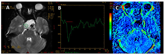 In the first step of the study, perfusion parameters were determined for normal-appearing white matter. A region of interest (ROI) was set in the right frontal lobe (a round area of approximately 500 mm2). The parameters measured were as follows: CBV (cerebral blood volume), S0 (signal intensity of the baseline of the perfusion curve), Smin (minimal signal value during the first pass of gadolinium contrast), S1 (signal intensity recovery 14 s after the beginning of the signal drop—the first passage of contrast through the vascular bed takes approximately 10 to 14 s). Subsequently, PH (peak height) and PSR (percentage of signal intensity recovery) were calculated with the following equations: PH = S0 − Smin; PSR = (S1 − Smin)/(S0 − Smin) (Figure 3). These perfusion measurements were necessary as reference points to obtain normalized (relative) values afterward.