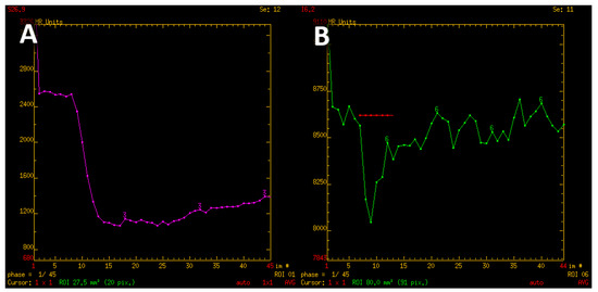 The percentage of signal return (PSR) was determined using the equation (S1 − Smin)/(S0 − Smin) that is available in all publications. S0 is the baseline signal of the perfusion curve and Smin is the lowest signal value during the first pass of contrast. However, there are no explicit recommendations for determining the S1 point. Bladowska et al. determined S1 as the value of the signal 24 seconds after the start of the perfusion curve [14]. In the Mangla et al. publication, S1 is the signal value at the end of the perfusion curve, while in the publication by Neska et al., S1 is the value at 24 seconds after Smin [19,20]. According to the publications by Cha et al., Mangla et al. and Lupo et al., S1 should be the signal value immediately after the first passage of contrast through the vascular bed [19,21,22]. The first decline of the signal corresponds to the first pass of contrast media, and takes approximately 10 to 14 seconds. Moreover, the shape of the perfusion curve of tumors does not always allow us to unequivocally evaluate the end of the first pass of the contrast media. This is why in our study we determined fixed S1 point as the signal value 14 seconds after the beginning of the signal slippage—it resembles a safe and reliable solution, convergent with Cha et. al.