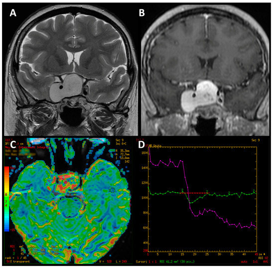 Tumors of the sellar and parasellar region represent a heterogeneous group of intracranial primary neoplasms and constitute approximately 10%–15% of central nervous system (CNS) tumors [1,2]. The most common are adenomas (which are interchangeably referred to as pituitary neuroendocrine tumors—PitNETs), meningiomas and craniopharyngiomas. However, in the sellar region may also occur other, less frequent lesions, such as Rathke’s cleft cysts, gliomas, metastases or abscesses. Clinical symptoms are often related to secretory malfunction of the pituitary gland and mass effect of the tumor on the adjacent anatomical structures. A proper diagnosis enables appropriate and effective therapy. Currently, the method of choice in the diagnostic process of the sellar and parasellar regions is magnetic resonance imaging (MRI) [3,4]. Conventional MRI sequences (T1-weighted and T2-weighted images, as well as contrast-enhanced T1-weighted sequences) do not always allow unambiguous identification of the type of lesion (Figure 1). Advanced MR techniques such as diffusion-weighted imaging (DWI), perfusion-weighted imaging (PWI) and magnetic resonance spectroscopy (MRS) allow us to obtain additional information, thus improving the accuracy of diagnosis. These techniques are still rarely used in routine clinical practice. The number of publications in the current literature is limited; the results are often contradictory and based on an inadequate number of subjects [5,6,7,8,9,10,11,12,13]. Therefore, the purpose of our study was to assess the value of PWI in the differential diagnosis of sellar and parasellar tumors, as an additional sequence in the MRI protocol in a substantial group of subjects.