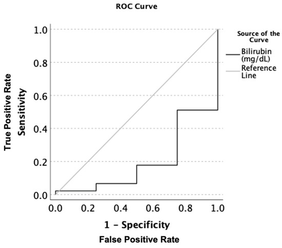 AUROC analysis of the serum total bilirubin levels (mg/dL) in all patients with alcoholic hepatitis when comparing magnesium deficient to magnesium non-deficient patients. Sensitivity describes the ability of this test to correctly identify patients with hypomagnesemia using total serum bilirubin. 1-Specificity is the ability of this test to correctly identify participants in this study without hypomagnesemia in the context of the total serum bilirubin.