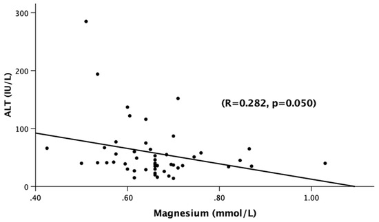 Association of serum magnesium levels (mmol/L) and ALT (IU/L) among all of the alcoholic hepatitis patients (Gr.1, Gr.2, Gr.3). Statistical significance was set at p < 0.05. The correlational coefficient (R) is provided.