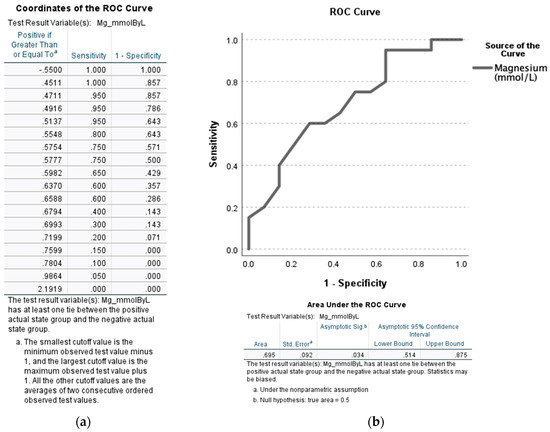 AUROC analysis of the serum magnesium levels (SMg [mmol/L]) among severe alcoholic hepatitis patients (MELD > 19) when compared to non-severe alcoholic hepatitis (MELD ≤ 19). (a) Coordinates of the ROC curve. (b) ROC curve with confidence interval (lower and upper bound) and area under the curve (area) provided at the bottom of the figure. Statistical significance was set at p < 0.05. Sensitivity describes the ability of this test to correctly identify severe AH patients with hypomagnesemia. 1-Specificity is the ability of this test to correctly identify the severe AH participants in this study with hypomagnesemia in the context of MELD scores.