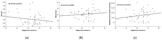 Association of the serum magnesium levels (mmol/L) and (a) AST:ALT ratio, (b) MELD score, (c) Maddrey’s discriminant function. (a) Association of the serum magnesium levels (mmol/L) and AST:ALT ratio among hepatitis patients with serum Mg < 0.78 mmol/L. (b) Association of the serum magnesium levels (mmol/L) and MELD score among all alcoholic hepatitis patients with serum Mg < 0.78 mmol/L. (c) Association of serum magnesium levels (mmol/L) and Maddrey’s discriminant function among all alcoholic hepatitis patients with serum Mg < 0.78 mmol/L. Statistical significance was set at p < 0.05. Correlational coefficient (R) is provided.