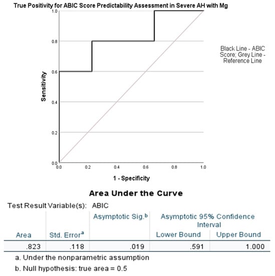 A higher ABIC score (more than 75% mortality within 1 month) that predicts low survivability could be shown at a greater true positive level fit of 0.823 at p = 0.019 with a magnesium cutoff chosen at 0.78 mmol/L (Figure 5). All five AH patients with the magnesium levels of Gr. 4 were also very severe in the entire cohort of severe AH patients from the initial analysis (Table 1).