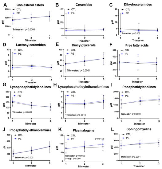 Standard lipid panels revealed well-recognized changes in triglycerides, total cholesterol, HDL, and LDL across pregnancy (Table S1) [25]. However, we found no differences in these variables between PE and CTL subjects at any trimester of pregnancy (Table S1). Therefore, we performed mass spectrometry-based targeted plasma lipidomics on the Lipidyzer platform to identify lipid subclasses or individual lipid species that might distinguish PE and CTL groups.