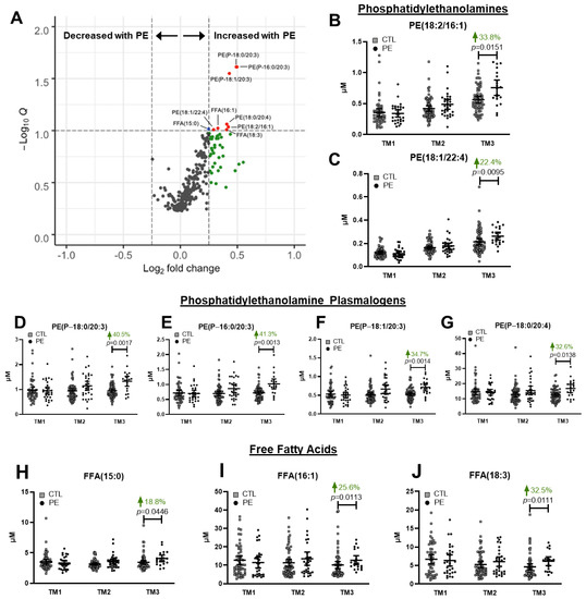 Plasma lipidomics afforded measurements of 280 individual lipid species in CTL and PE groups at each trimester of pregnancy. We first probed for individual lipid species whose concentrations differed between groups by performing multiplicity adjusted (FDR < 0.1) Mann–Whitney U tests on data from each trimester. Surprisingly, there were no significant differences in any lipid species between groups during the first two trimesters. During the third trimester, however, there were nine lipid species that were significantly higher in PE patients (Figure 2A). We analyzed these nine lipids individually throughout the course of pregnancy using linear mixed effects models. Two PtdEtn lipids with ester fatty acid linkages, PtdEtn (18:2/16:1) and PtdEtn (18:1/22:4) were 33.8% and 22.4% higher in PE women, respectively (Figure 2B,C). Additionally, several plasmalogen PtdEtn lipids were significantly higher in PE pregnancies including 18:0/20:3 (40.5%, Figure 2D), 16:0/20:3 (41.3%, Figure 2E), 18:1/20:3 (34.7%, Figure 2F), and 18:0/20:4 (32.6%, Figure 2G). Three FFA species, 15:0 (18.8%, Figure 2I), 16:1 (25.6%, Figure 2H), and 18:3 (32.5%, Figure 2J), were also greater in the PE group. While some of these lipids were slightly higher in PE during the second trimester, they all only became significantly increased by the third trimester.