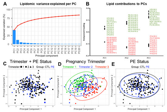 Unsupervised principal component analysis of plasma lipidomes from pregnant women with and without PE in the setting of obesity. (A) Scree plot showing the percent of lipidomic variance explained by each principal component. (B) Individual lipids which contribute most strongly to the first three principal components. The top 10 positive contributing lipids are shown in green and the top 10 negative lipids are shown in red. (C–E) Lipidomic data projected onto the first two principal components. Each data point represents a specific sample. Data are displayed by (C) trimester and group, (D) trimester, and (E) group. Ellipses indicate the 95% confidence ellipse of each group.