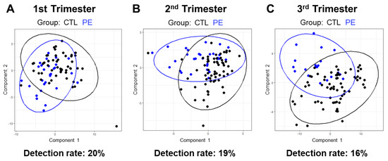 Lipidome-based PE prediction using supervised sparse partial least squares discriminant analysis. (A–C) Lipidomic data projected onto the first and second components of an sPLS-DA model built using data from each of the indicated trimesters. Ellipses indicate the 95% confidence interval of each group. The PE detection rate for each trimester-specific model is shown below its corresponding plot.