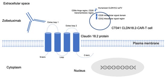- Botta, G.P.; Becerra, C.R.; Jin, Z.; Kim, D.W.; Zhao, D.; Lenz, H.-J.; Ma, H.; Ween, A.; Acha, P.; Li, Z.; et al. Multicenter phase Ib trial in the U.S. of salvage CT041 CLDN18.2-specific chimeric antigen receptor T-cell therapy for patients with advanced gastric and pancreatic adenocarcinoma. J. Clin. Oncol. 2022, 40, 2538. [Google Scholar] [CrossRef]