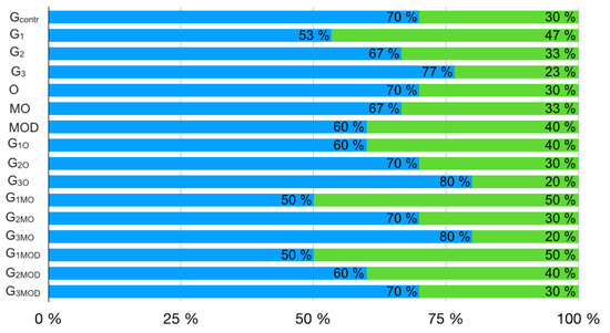 | Statistical analysis (p < 0.05) | G1O, G2O < GContr G1O, G2O < G3O | G1MO, G2MO < GContr G1MO, G2MO < G3MO | G1MOD, G2MOD < GContr G1MOD, G2MOD < G3MOD | |