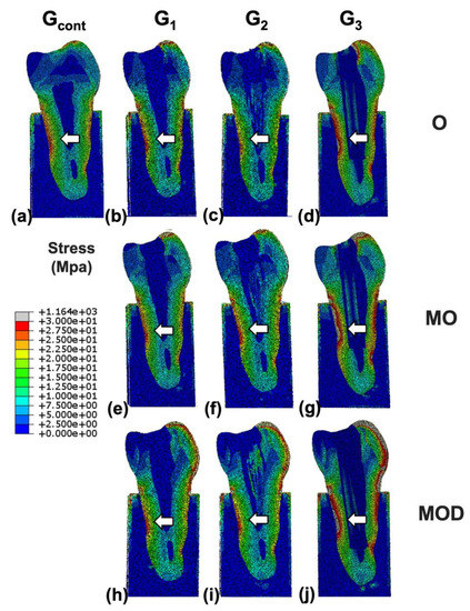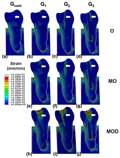 - MacHado, A.C.; Soares, C.J.; Reis, B.R.; Bicalho, A.A.; Raposo, L.H.A.; Soares, P.V. Stress-strain analysis of premolars with non-carious cervical lesions: Influence of restorative material, loading direction and mechanical fatigue. Oper Dent. 2017, 42, 253–265. [Google Scholar] [CrossRef] [PubMed]