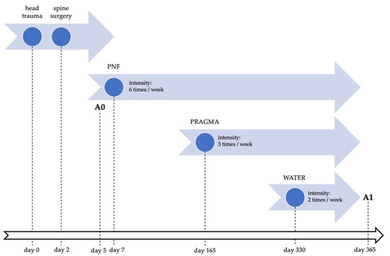Neurorehabilitation and assessment timeline. Abbreviations: PNF, proprioceptive neuromuscular facilitation; PRAGMA, physical therapy using PRAGMA Pro device; WATER, water rehabilitation; A0, baseline assessment; A1, control assessment.