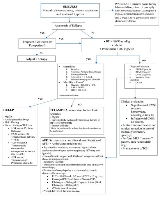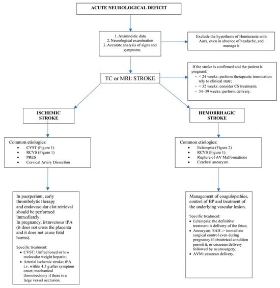 - Edlow, J.A.; Caplan, L.R.; O’Brien, K.; Tibbles, C.D. Diagnosis of acute neurological emergencies in pregnant and post-partum women. Lancet Neurol. 2013, 12, 175–185. [Google Scholar] [CrossRef] [PubMed]