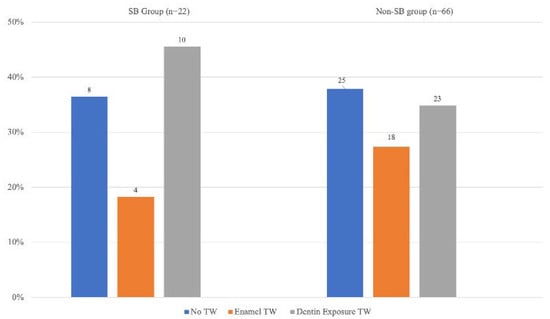 Concerning the sleep parameters, the mean value of the three recordings was computed. No statistically significant differences emerged between the SB group and non-SB group for all the variables analyzed. Figure 2 shows the differences in clinical tooth wear between the two groups: the subjects were divided into three categories corresponding to absence of tooth wear, tooth wear limited to the enamel layer and tooth wear with dentin exposure.