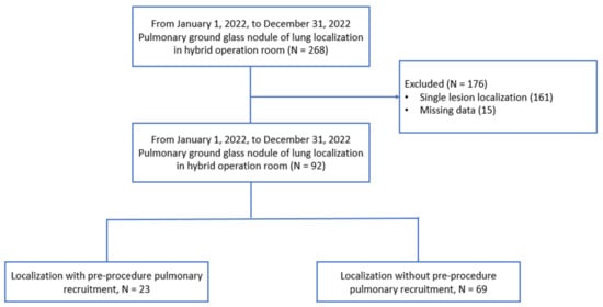 We retrospectively reviewed all patients who underwent hybrid-operating-room multiple pulmonary nodule localization before surgical intervention at Chung Shan Medical University Hospital (CSMUH) between 1 January 2022 and 31 December 2022. The inclusion criteria were: (1) age higher than 18 years, (2) lung function examination classification as low risk on the American College of Chest Physicians (ACCP) perioperative surgical risk evaluation (both forced expiratory volume and diffusion capacity of carbon monoxide ≥ 80% predicted), and (3) multiple pulmonary ground-glass nodules for localization. In all, 23 patients underwent pre-procedure pulmonary recruitment, and 69 patients did not undergo recruitment. The decision to perform pre-procedure pulmonary recruitment was based on the surgeon’s and anesthesiologist’s preference and recorded in the anesthesia record. The details of the inclusion, exclusion, and classification of the patients in the study are shown in Figure 1. Perioperative parameters, including pulse oximetry, apnea time, re-inflation rate, pneumothorax, and total procedure time, were analyzed. This study was approved by the CSMUH Ethics Committee (Approval No. CS1-23036).