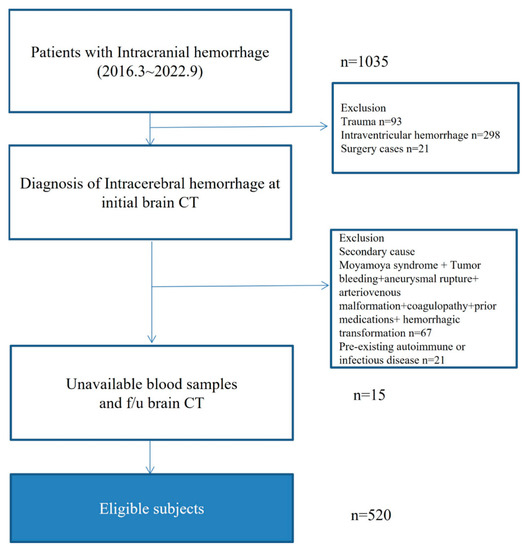 - Wang, Z.; Gong, Q.; Guo, C.; Luo, Y.; Chen, L. Neutrophil-to-lymphocyte ratio predicts hematoma growth in intracerebral hemorrhage. J. Int. Med. Res. 2019, 47, 2970–2975. [Google Scholar] [CrossRef] [PubMed]
