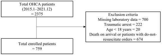 During the study period, 2375 patients with OHCA were admitted to the ED. Among them, 1616 patients were excluded from the analysis because of the following factors: absence of laboratory biomarker data (n = 700), trauma (n = 222), age < 18 years (n = 20), death on arrival or those with do-not-resuscitate orders (n = 674). Therefore, 759 patients were enrolled in the final analysis (Figure 1). Among the patients with ROSC, those who were transferred were excluded (n = 34).