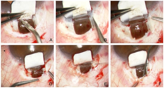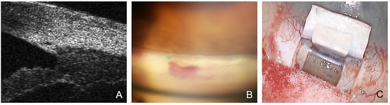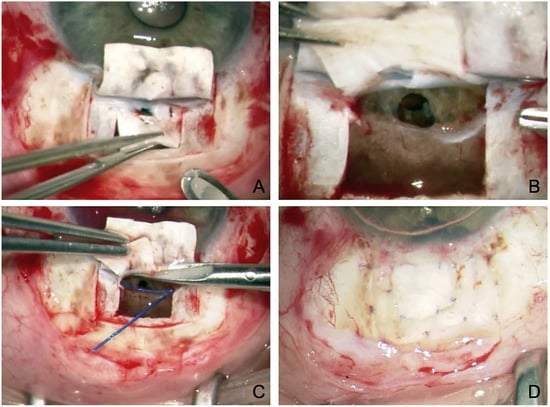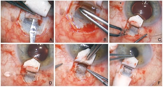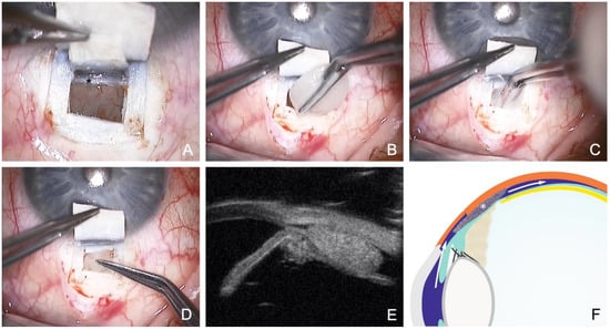 - Szurman, P.; Januschowski, K.; Boden, K.T.; Seuthe, A.M. Suprachoroidal drainage with collagen sheet implant—A novel technique for non-penetrating glaucoma surgery. Graefes Arch. Clin. Exp. Ophthalmol. 2018, 256, 381–385. [Google Scholar] [PubMed]
