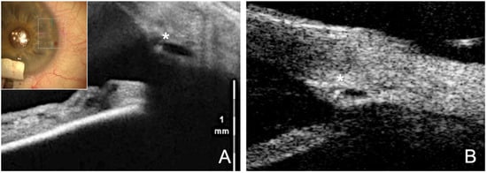 Visible effect of the tension suture stretching the SC. (A) Intraoperative visualization of the SC with intraoperative OCT. Asterisk marks the catheter tip within the lumen. (B) Postoperative UBM (50 MHz) clearly shows the dilated and stretched SC with knotted suture in the lumen (asterisk).