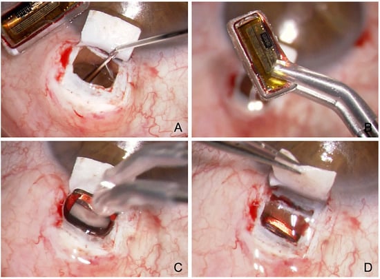 Suprachoroidal implantation of the Eyemate-SC IOP sensor (7.5 × 3.5 mm and an outwardly decreasing thickness of 1.3 mm in the center and 0.9 mm on the periphery) can be excellently combined with CP (Figure 7). Both procedures can be consecutively performed using the same access point. This is easiest in CP with ScD, since a choroidal window is prepared anyway, and the sensor can be used as a placeholder in the same way as the Ologen implant (https://youtu.be/F_p9iIGxB9U, accessed on 8 December 2018) [52].