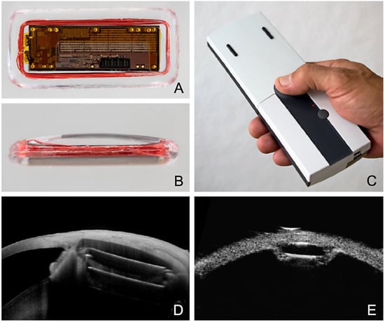 Eyemate-SC sensor looking at the electronics from (A) the top and (B) the side. (C) Mesograph readout device for wireless telemetric IOP measurement. Multimodal imaging 6 months after suprachoroidal implantation of the Eyemate-SC sensor. (D) An anterior segment (AC)-OCT visualizes the microelectronics carrier substrate, but not the silicone encapsulation. (E) The UBM image (50 MHz) depicts the lens-shaped rounded silicone encapsulation smoothly adapting to the curved scleral shape.