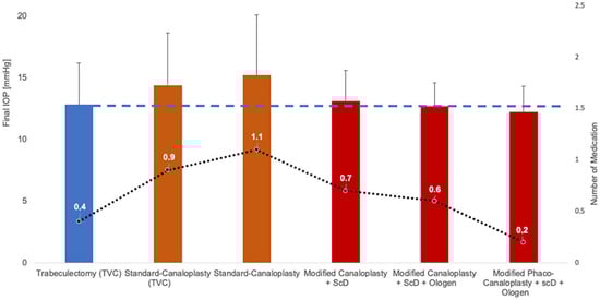 Evolution of canaloplasty modifications to improve the IOP-lowering success and the amount of remaining medication. This continuous refinement, especially the combination with ScD, allows CP to achieve IOP values comparable to TE (dashed line) and a low number of medications (dotted line) for the first time, but without the complications of TE [13,16,22,30,31,41].