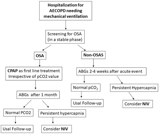Shows a suggested algorithm for the management of patients after acute exacerbation of chronic obstructive pulmonary disease (AECOPD). Once patients are clinically stable (improved symptoms, normal pH despite weaning from NIV, no more need for antibiotics or oral steroids, no signs of cardiovascular decompensation), they should be screened for obstructive sleep apnea (OSA). Those diagnosed with OSA should start with continuous positive airway pressure (CPAP) therapy. Then, be followed up with as per the algorithm. Non-OSA patients should have arterial blood gases (ABG’s) one month post-exacerbation and be managed as per the flow chart. NIV is non-invasive ventilation.