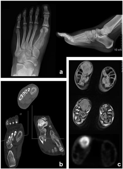Ewing sarcoma (ES) is usually observed in males (O.R. of 1.5) in the first two decades of life. ES is the third most frequent primary bone tumor affecting long bones (47%, mainly in the diaphysis), the pelvis, the chest wall, and the spine, even if it can rarely originate from soft tissue. The small bones of the foot are rarely involved, ranging from 3% to 5% of the reported cases [41]. Patients with ES of the foot commonly have a few months’ history of painful swelling, which can impair ambulation and shoe-wearing. Ewing sarcoma can be misdiagnosed as osteomyelitis, resulting in delayed diagnosis. Pathological fractures may affect the involved bone at initial presentation or during/after treatment [42]. Radiographs show a lytic lesion with a permeative appearance through the cortex, with a large extra-osseous component. As for OS, MR is the most appropriate imaging test for assessing tumor volume and guiding surgical and chemo-/radiotherapy treatment [43] (Figure 2).