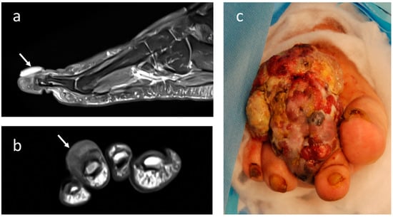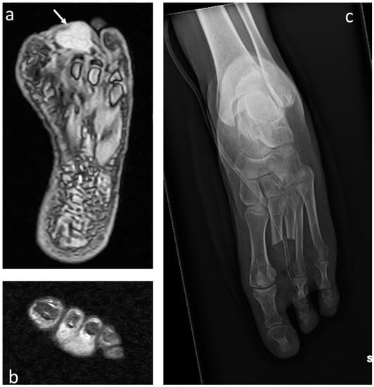 Clear-cell sarcoma of the foot (white arrows) in a 60-year-old female: (a) T2 STIR MRI showing the mass with increased signal intensity in axial and (b) coronal projection infiltrating the second and third finger. (c) Postoperative plain radiograph after double-ray amputation.