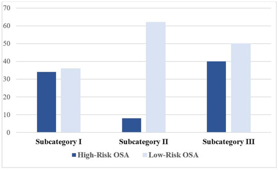 As illustrated in Figure 1, out of 70 participants, 27 (38.6%) were categorized as having a high risk of OSA based on the mBQ. Overall, 34 cases (48.6%) were categorized as positive on snoring intensity and/or snoring frequency (Subcategory I), 8 cases (11.4%) on witnessed apneas (Subcategory II), and 40 cases (57.1%) on the tiredness in the morning and/or during the whole day (Subcategory III).